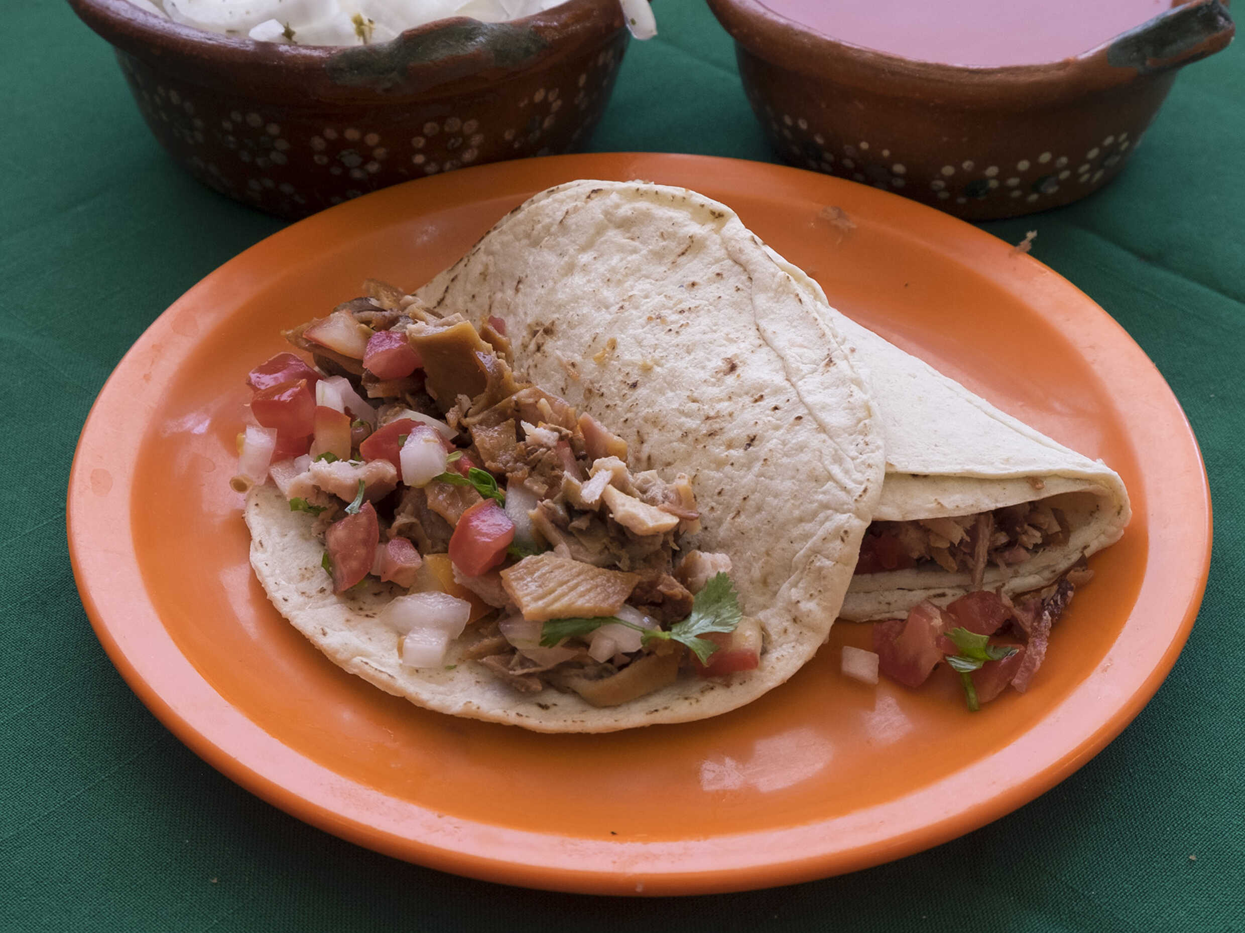 Taco personal, Carne (opcional), cebolla blanca y morada, salsa de tomate, picante.