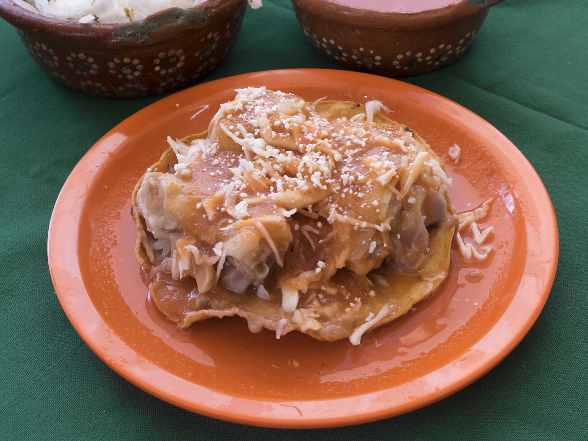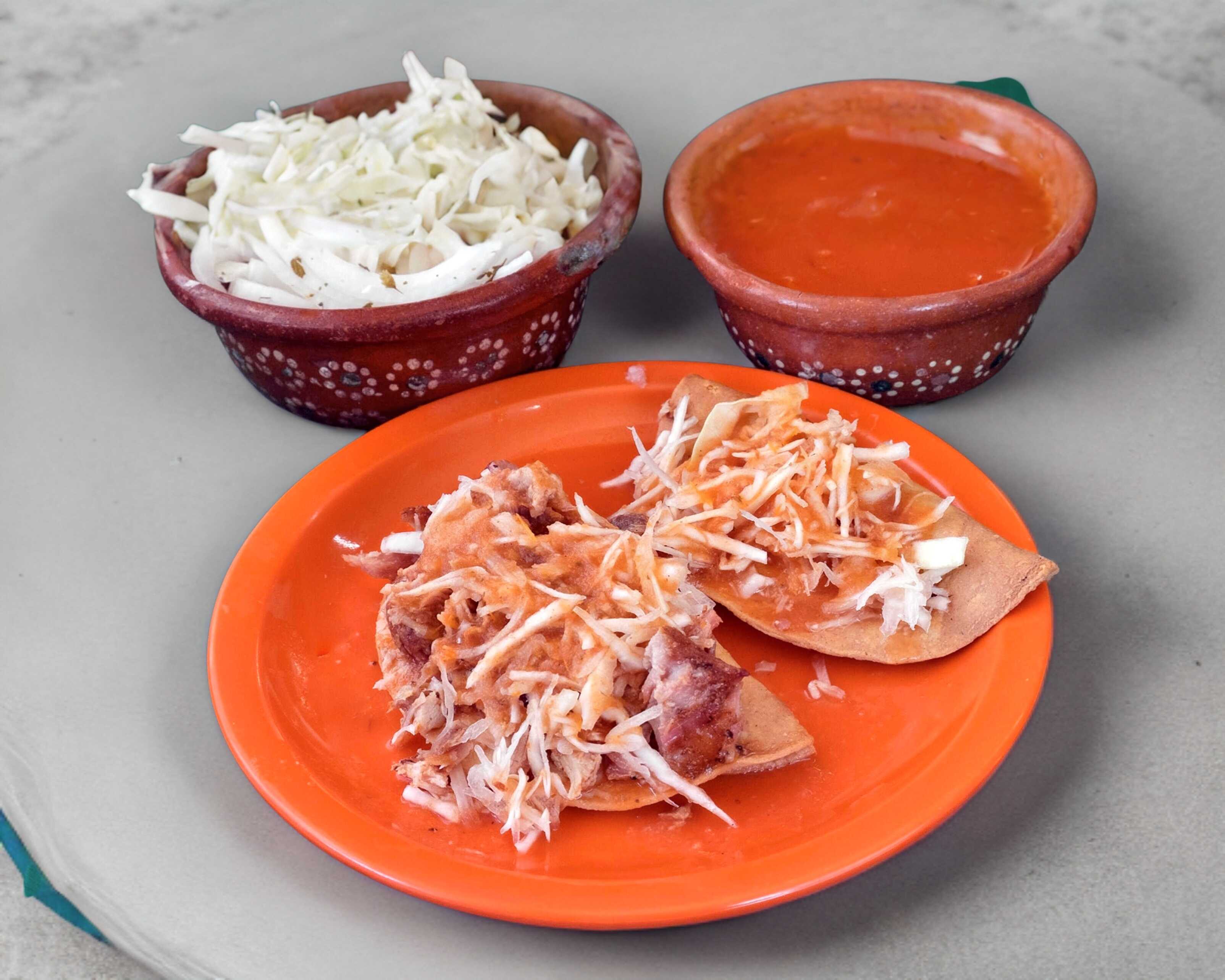 Tostada Grande hornead, frijoles, pata, col, cebollita y salsa