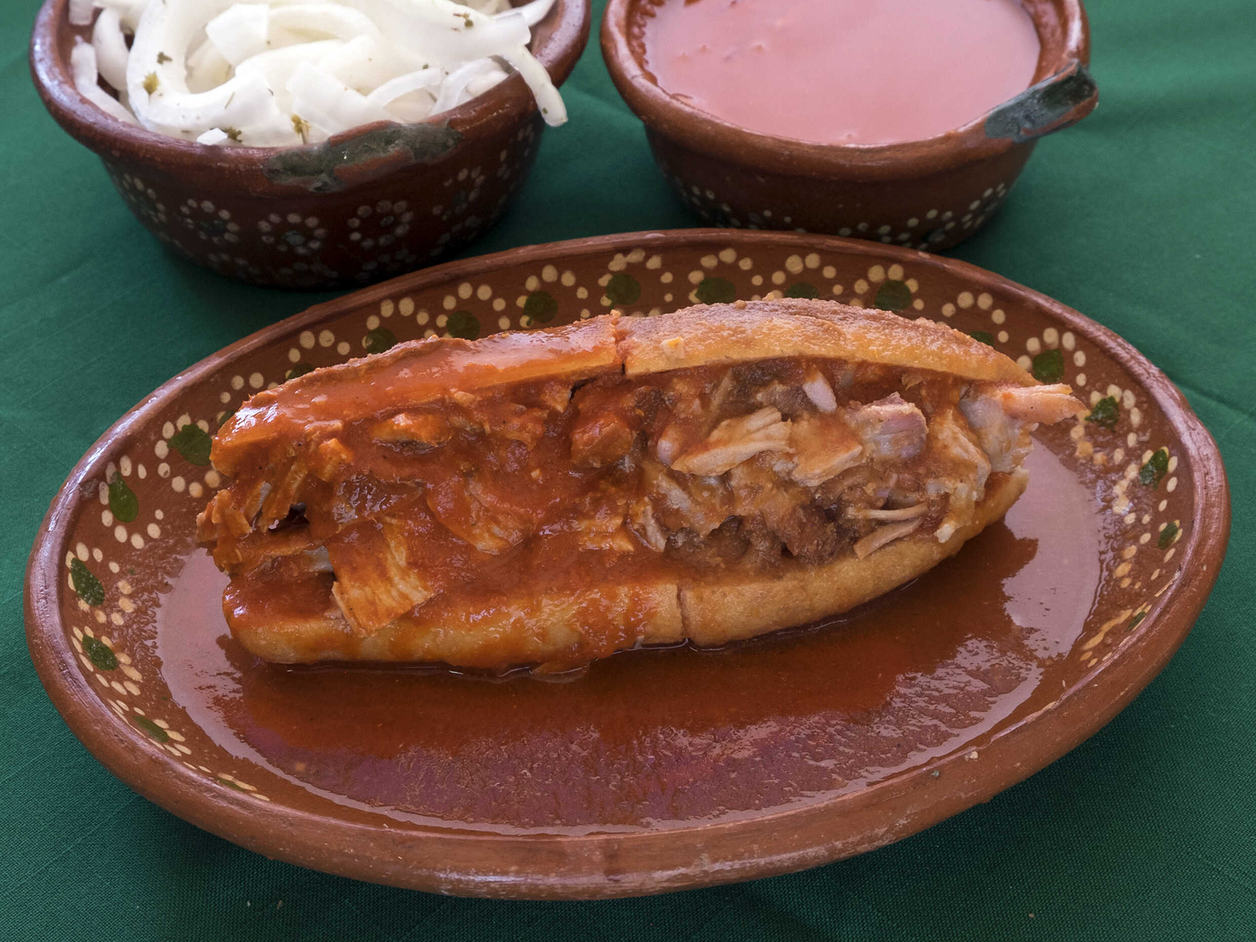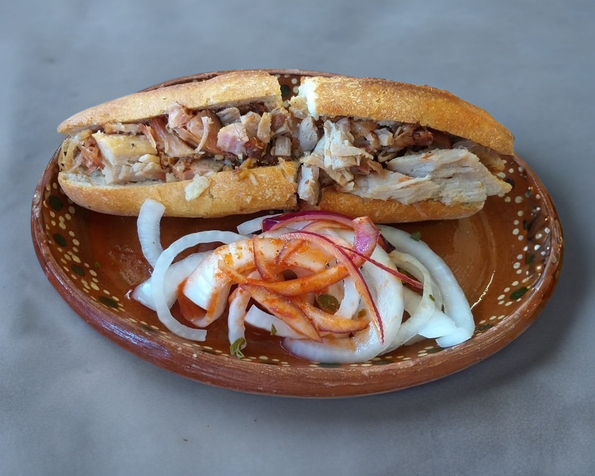 Torta personal preparada carne picada de puerco, frijoles embarrados (pequeña cantidad), salsa de tomate, salsa picante, cebolla blanca y morada, limones