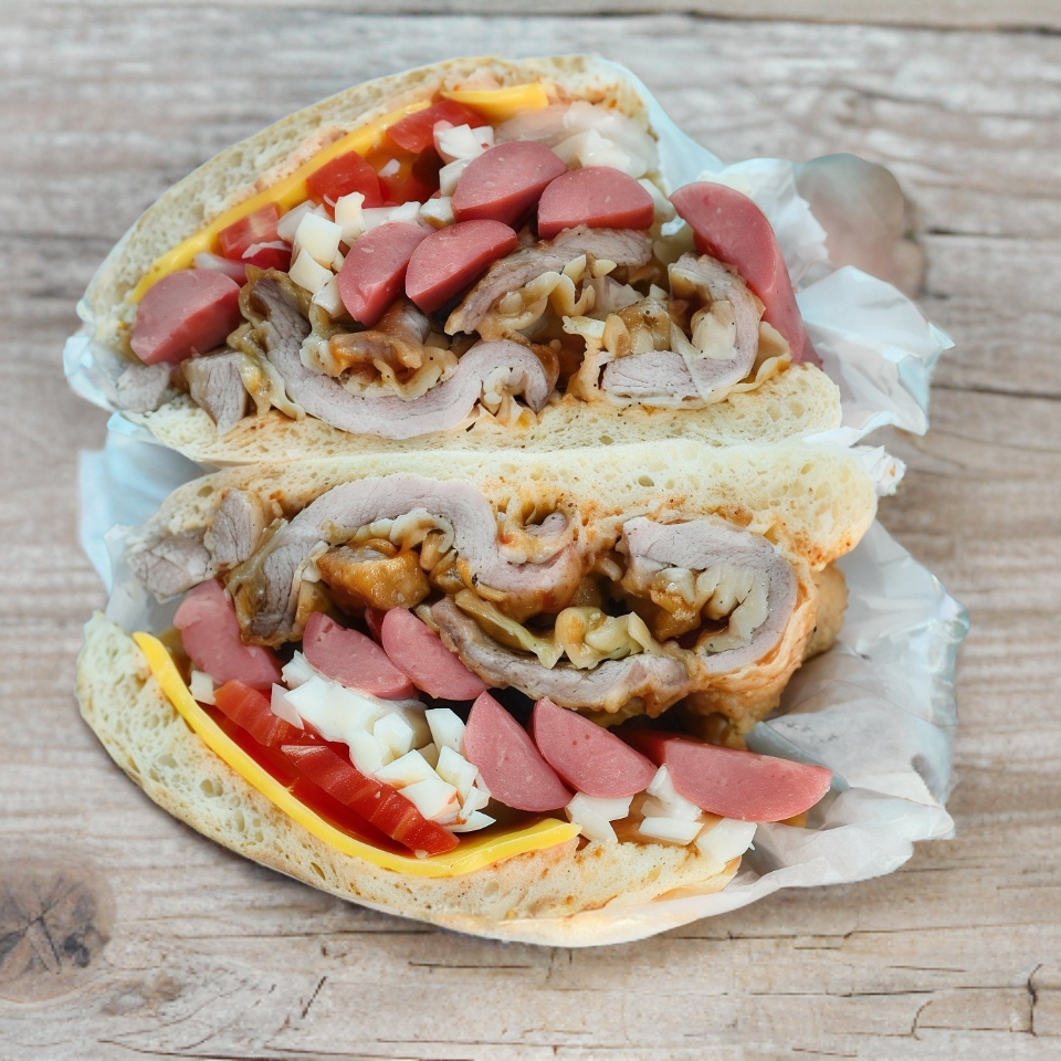 Exquisito pan telera grande,milanesa, salchicha, queso oaxaca, queso amarillo, jitomate,cebolla y aderezo chipotle