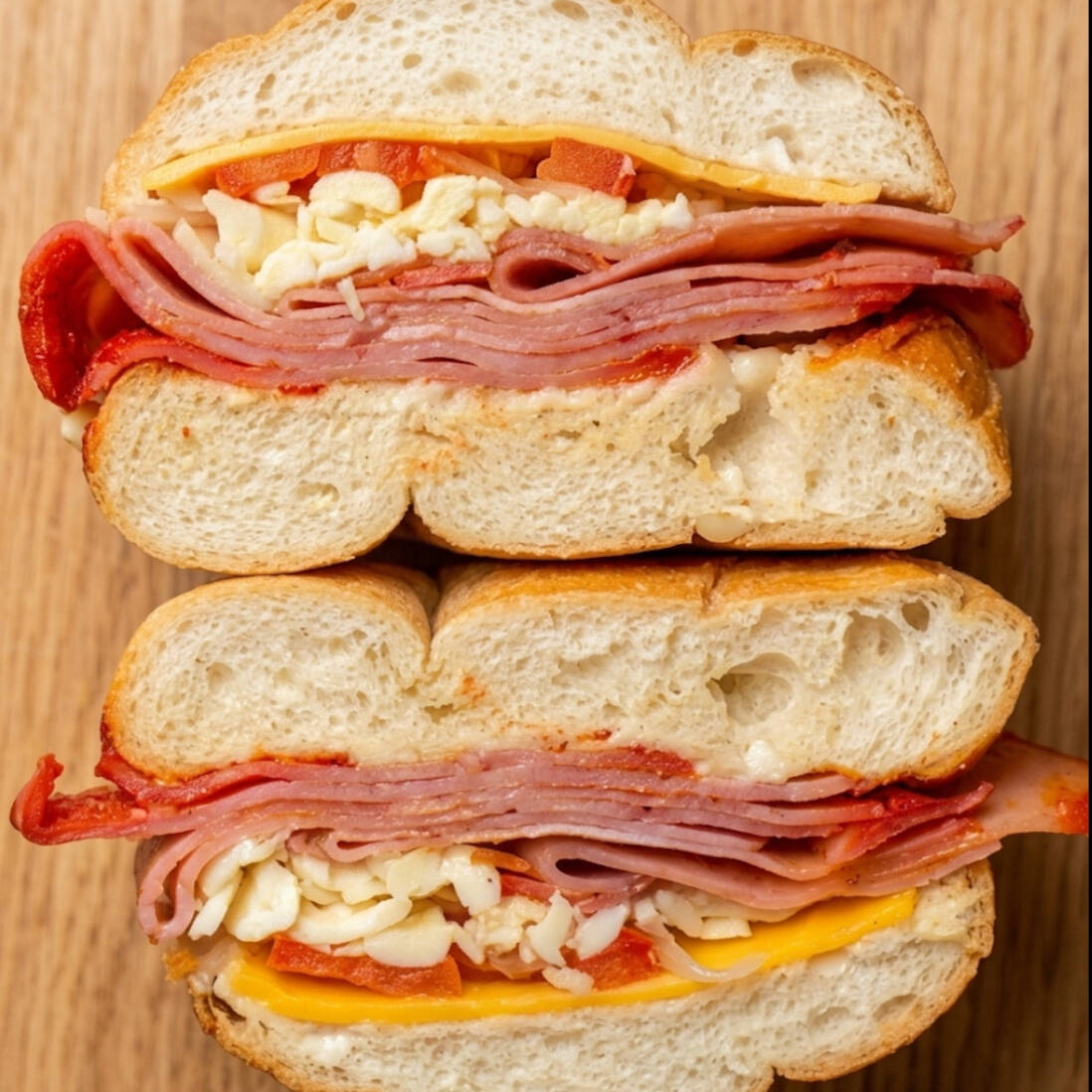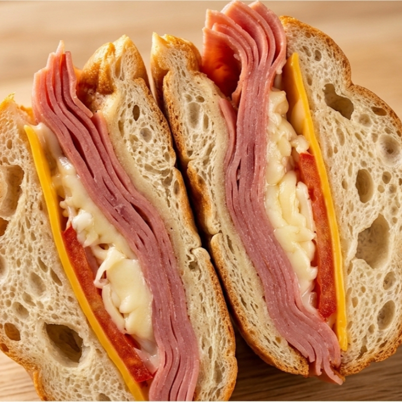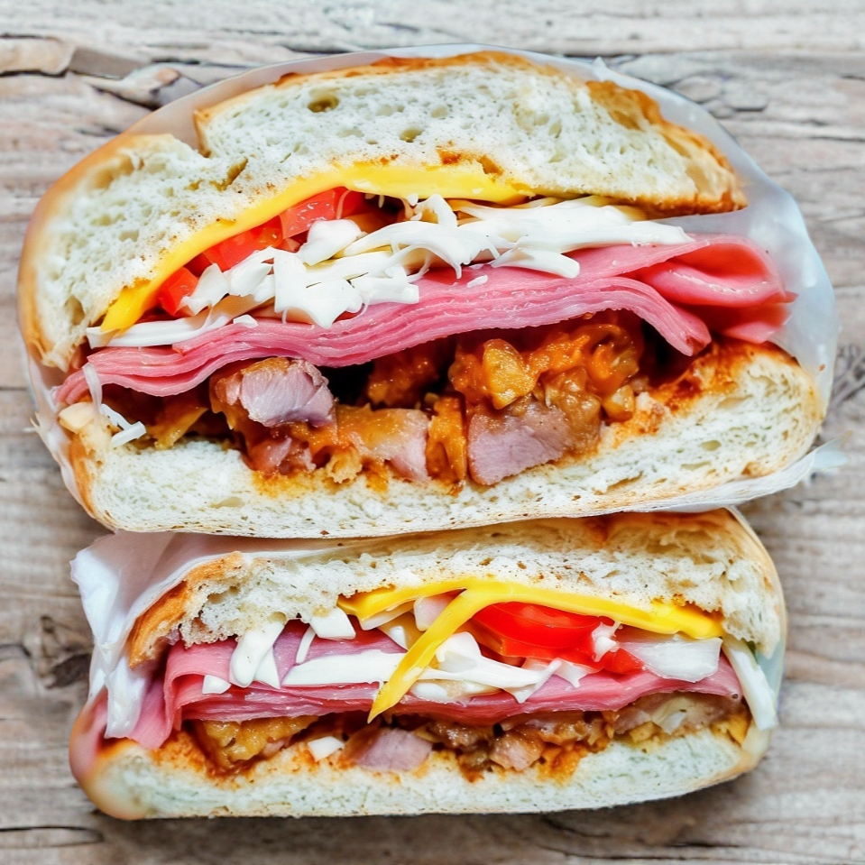 Pan telera grande,jamón,chuleta y milanesa ,queso oaxaca y queso amarillo, jitomate , cebolla y aderezo de chipotle