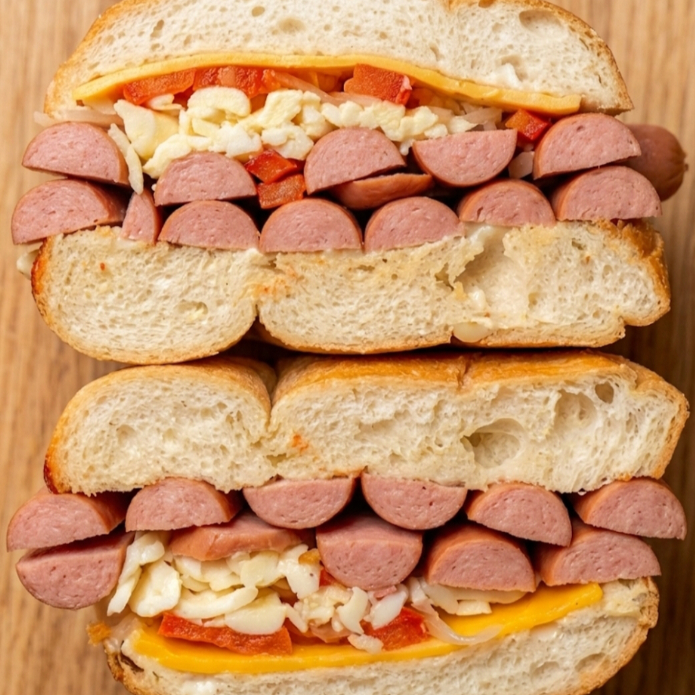Milanesa, salchicha, queso y queso amarillo, más grande.