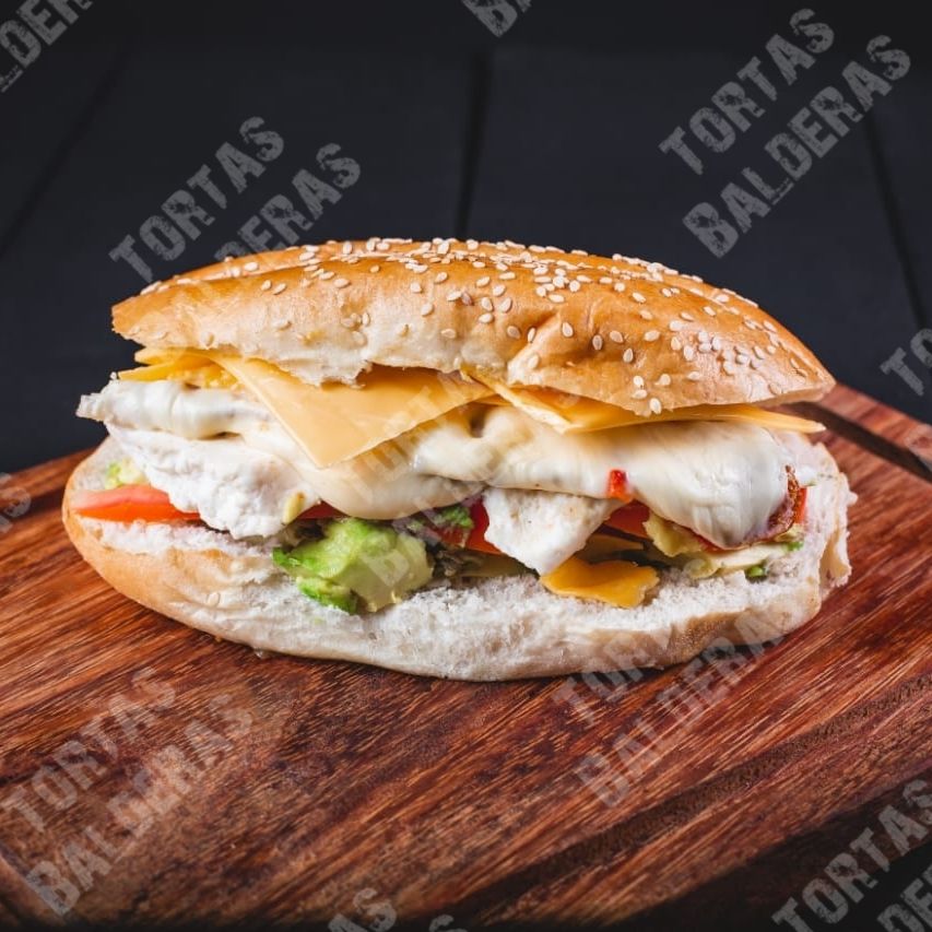 Deliciosa torta con salchicha, pollo y queso oaxaca (incluye aguacate, jitomate y cebolla).