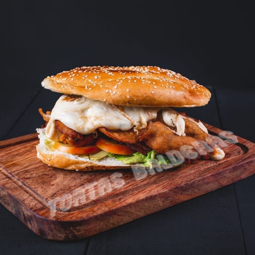 Deliciosa hamburguesa con carne, jamón y queso.