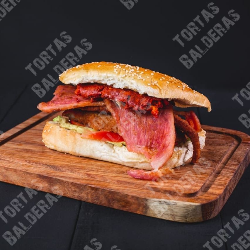 Deliciosa torta con milanesa, pierna y queso oaxaca (incluye aguacate, jitomate y cebolla).