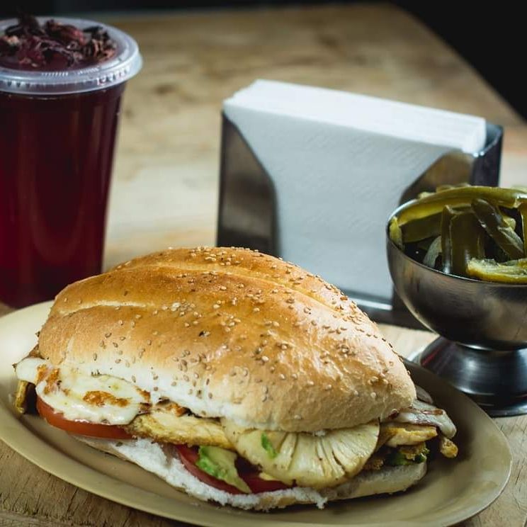 Deliciosa torta con pollo, piña y queso oaxaca (incluye aguacate, jitomate y cebolla).