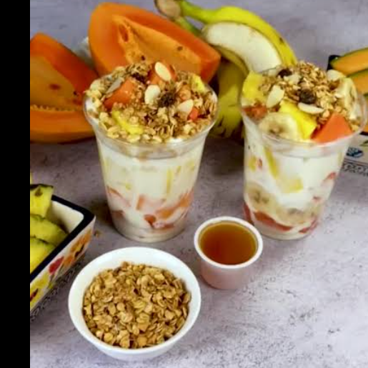 Manzana plátano papaya en vaso de litro granola coco lechera