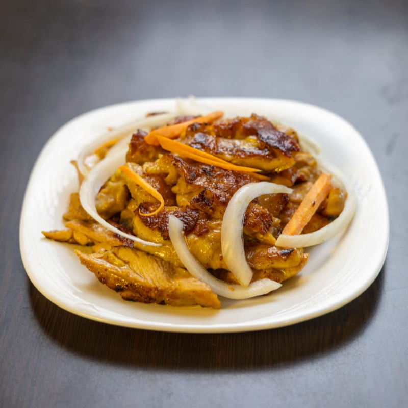 Pollo salteado con zanahoria y cebolla. Cubierto con nuestra deliciosa y ahumada salsa BBQ.