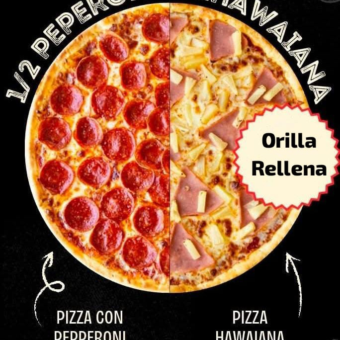Deliciosa pizza mitad pepperoni y mitad hawaiana con orilla rellena.
