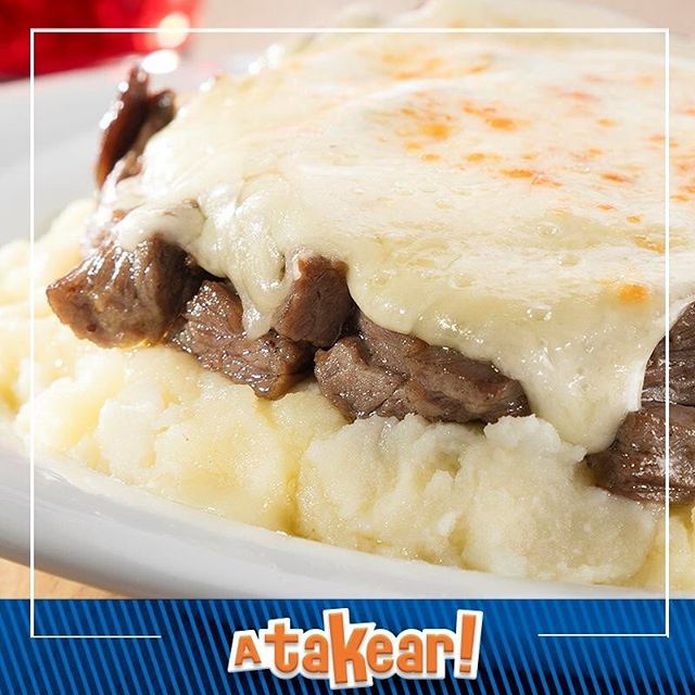 Exquisita carne sobre una base de puré de papa a la mantequilla y gratinada con queso gouda