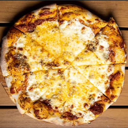 Salsa de tomate casera, queso mozzarella, queso gorgonzola y queso parmesano.