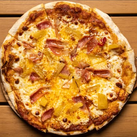 Salsa de tomate, queso mozzarella, piña dorada, tocino y miel picante.