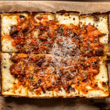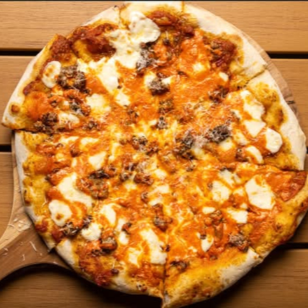 Masa de charola con masa madre, con orilla caramelizada de queso mozzarella, salsa de tomate casera, salchicha italiana, queso parmesano y salsa picante cremosa.