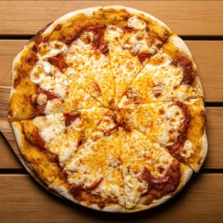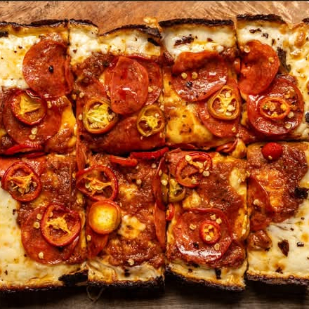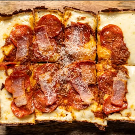 Masa de charola con masa madre, orilla caramelizada de queso mozzarella, salsa de tomate casera, pepperoni, tocino y queso parmesano.