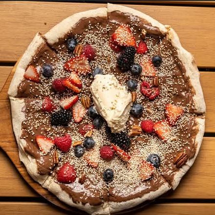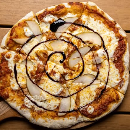 Salsa de tomate, queso mozzarella, pera, jamón serrano y reducción de vinagre balsámico.