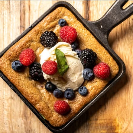 Galleta de chispas de chocolate con bola de helado y mix de frutos rojos.