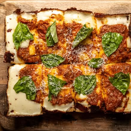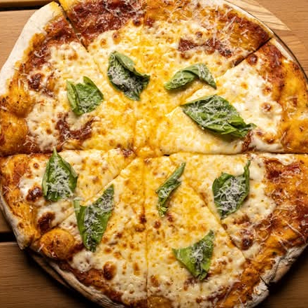 Deliciosa masa de charola hecha con masa madre, con orilla caramelizada de queso mozzarella, salsa de tomate casera y albahaca.