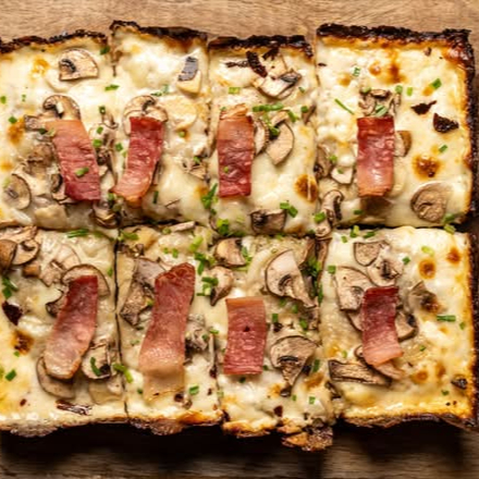 Masa de charola con masa madre, orilla caramelizada de queso mozzarella, salsa Alfredo cremosa, champiñones y cebollín.