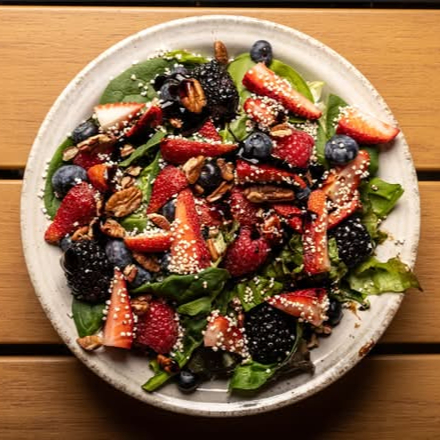 Fresca ensalada de base espinaca baby y lechuga, con fresa, frambuesa, berries, amaranto y nuez.