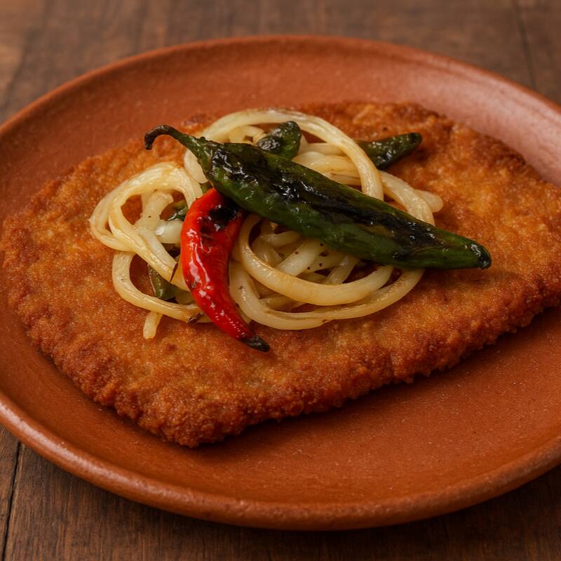 Crujiente milanesa de Cerdo servida con una mezcla de cebollas y chiles toreados, que le dan un toque picosito y lleno de sabor. Una opción ideal para quienes disfrutan de lo clásico con un toque picante y casero. Incluye tortillas hechas a mano, salsas para acompañar y 2 guarniciones a elegir.