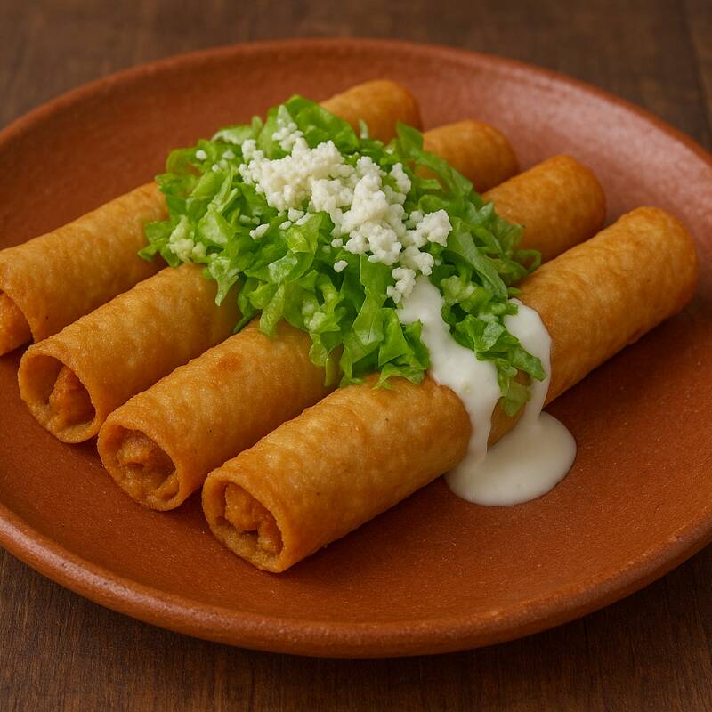 3 Flautas grandes doradas rellenas de pechuga de pollo deshebrada, servidas con lechuga fresca, queso ranchero y crema. Un antojito tradicional que nunca falla, preparado con el toque de casa. Incluye salsas para acompañar y 2 guarniciones a elegir.