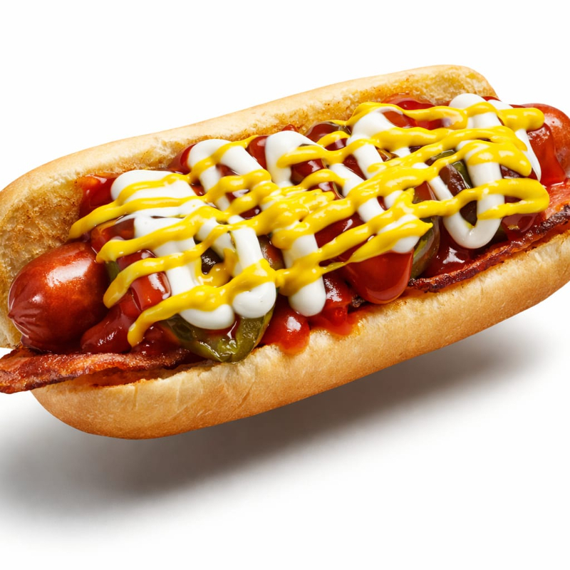 Pan Super Grande, Salchicha Jumbo, Tocino, Jitomate, Cebolla, Jalapeño, Catsup, Mostaza