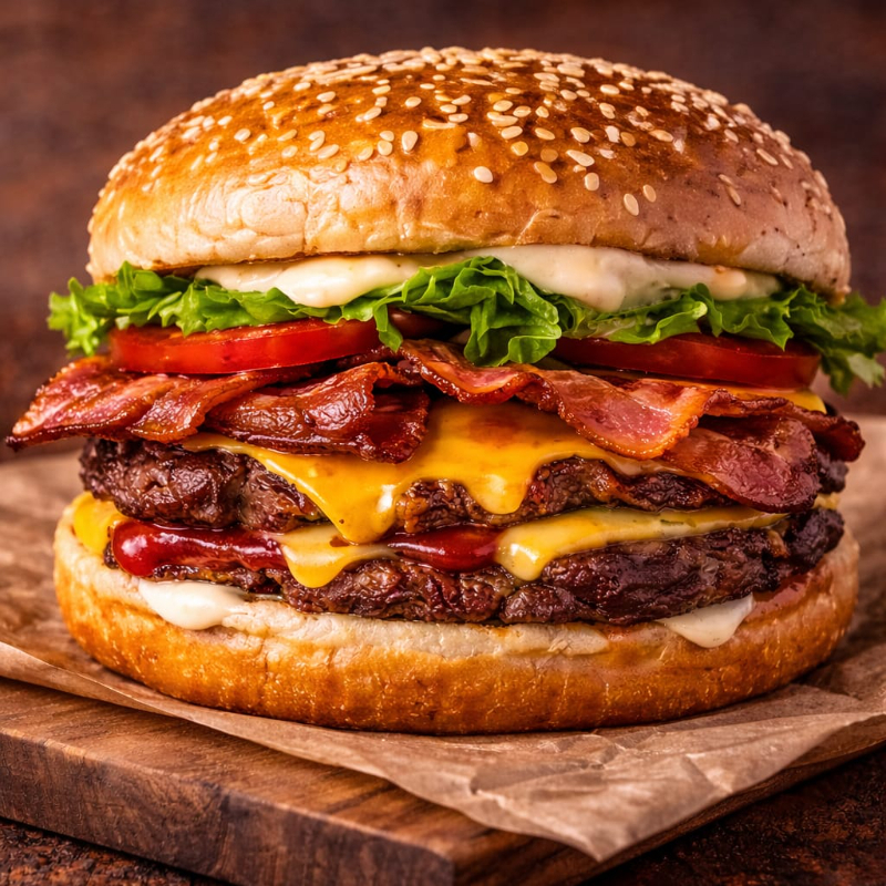 Bollo Parrillero, Doble Carne Res 240gms, Doble Queso americano, Doble Tocino, Lechuga, Jitomate, Cebolla, Jalapeño, Catsup, Mostaza