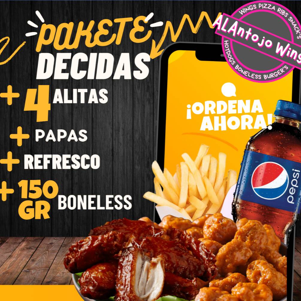 4 Alitas, 150gr De Boneless, Papas A La Francesa, Vegetales, Aderezo Ranch y Refresco 600ml