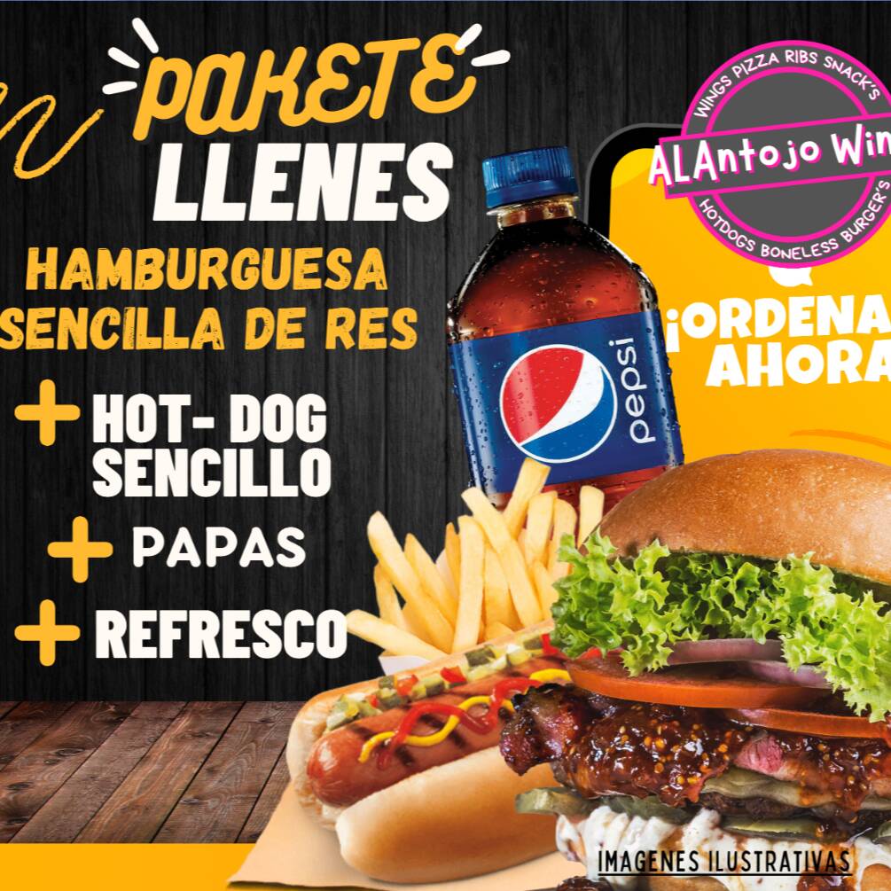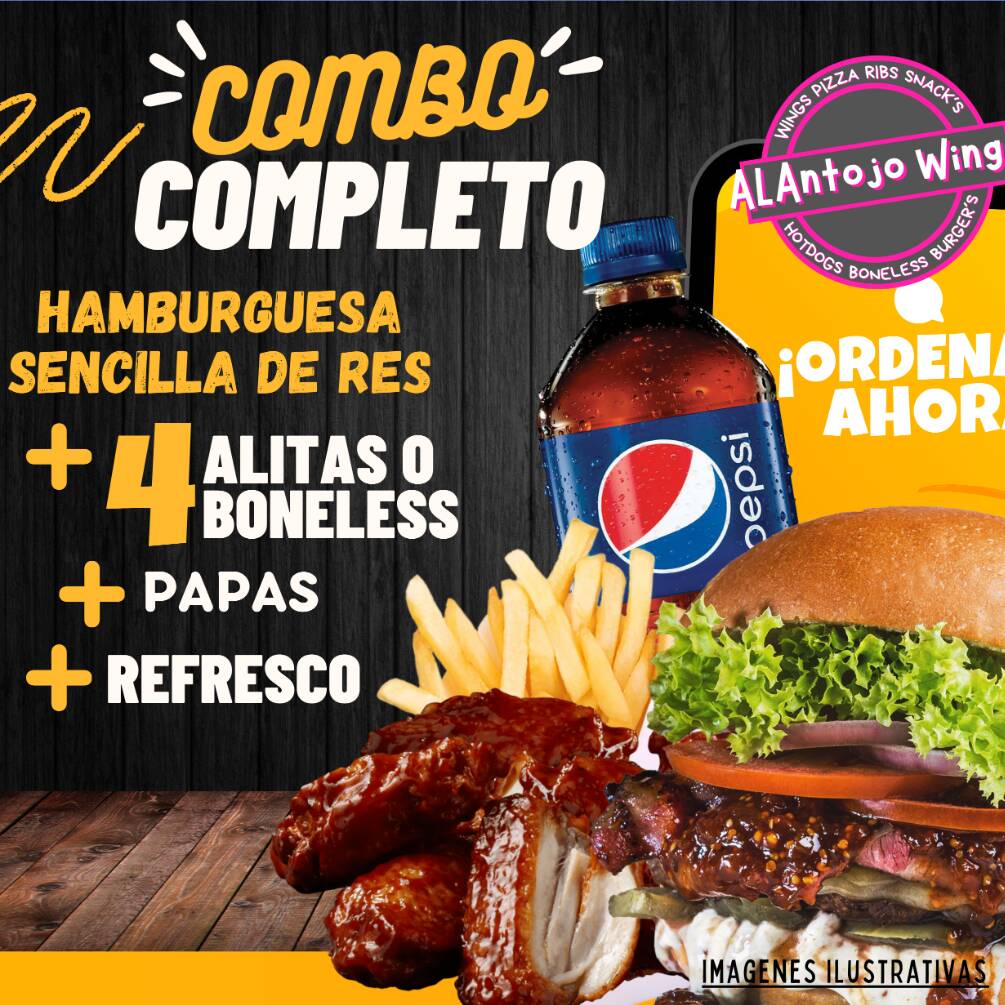 Hamburguesa Sencilla De Res, 4 Alitas o Boneless, Papas A La Francesa y Refresco 600ml