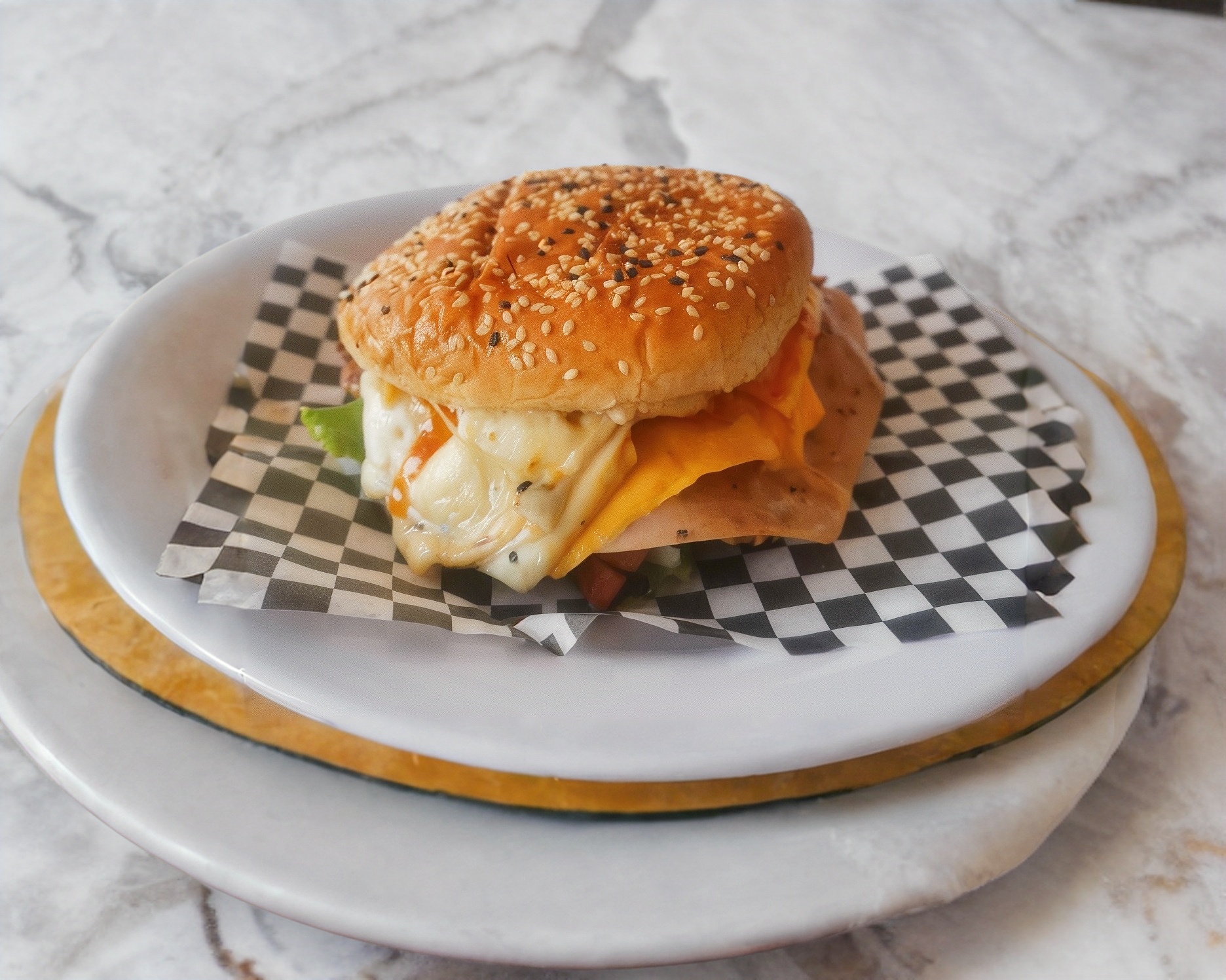 Pan, mayonesa, catsup, doble queso amarillo, doble jamón, jitomate, cebolla, chiles,queso oaxaca doble carne