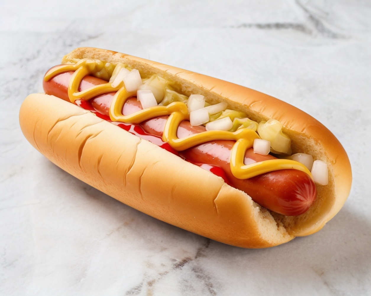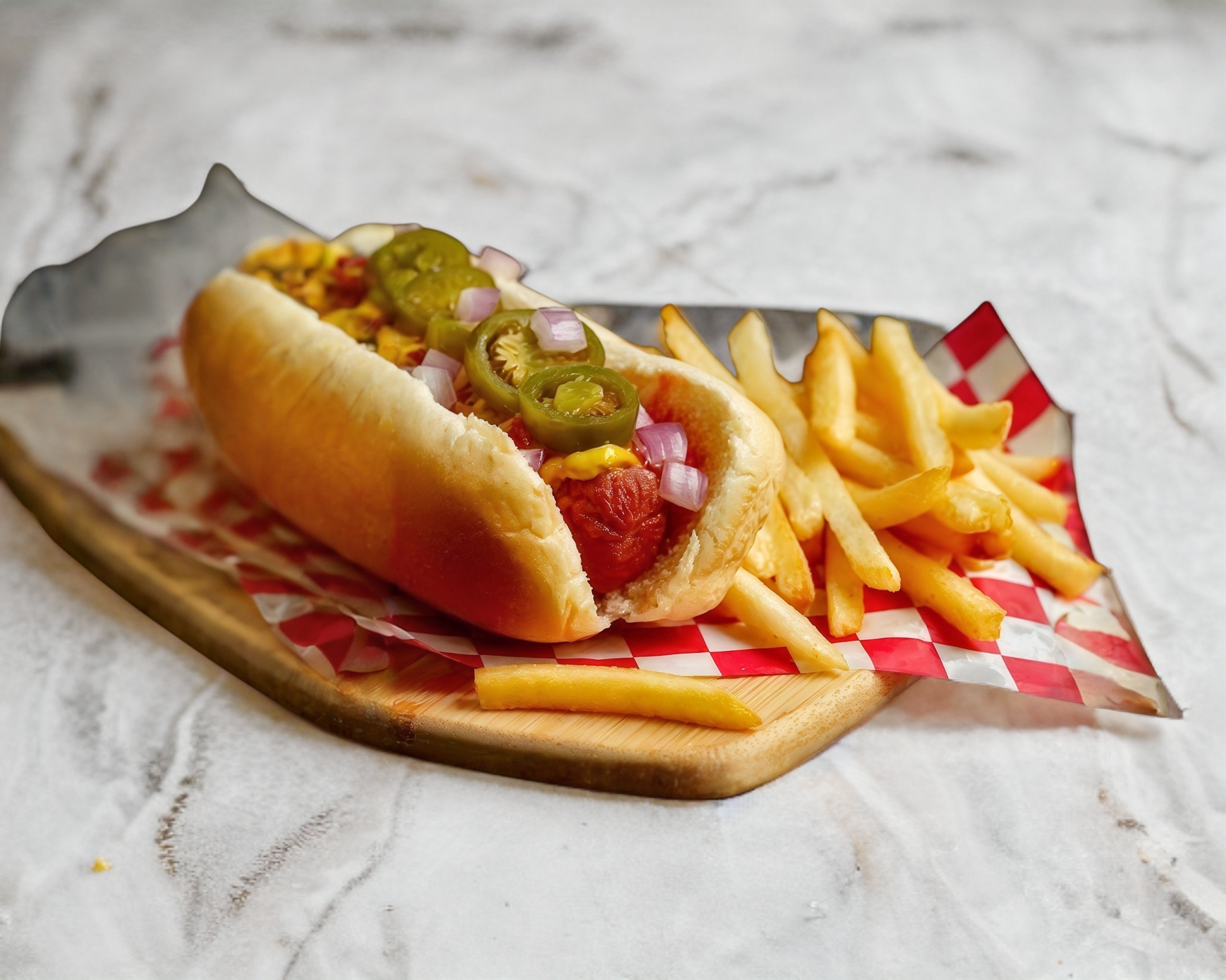 Pan calientito con su salchicha y tocino jitomate, cebolla y chiles en vinagre
