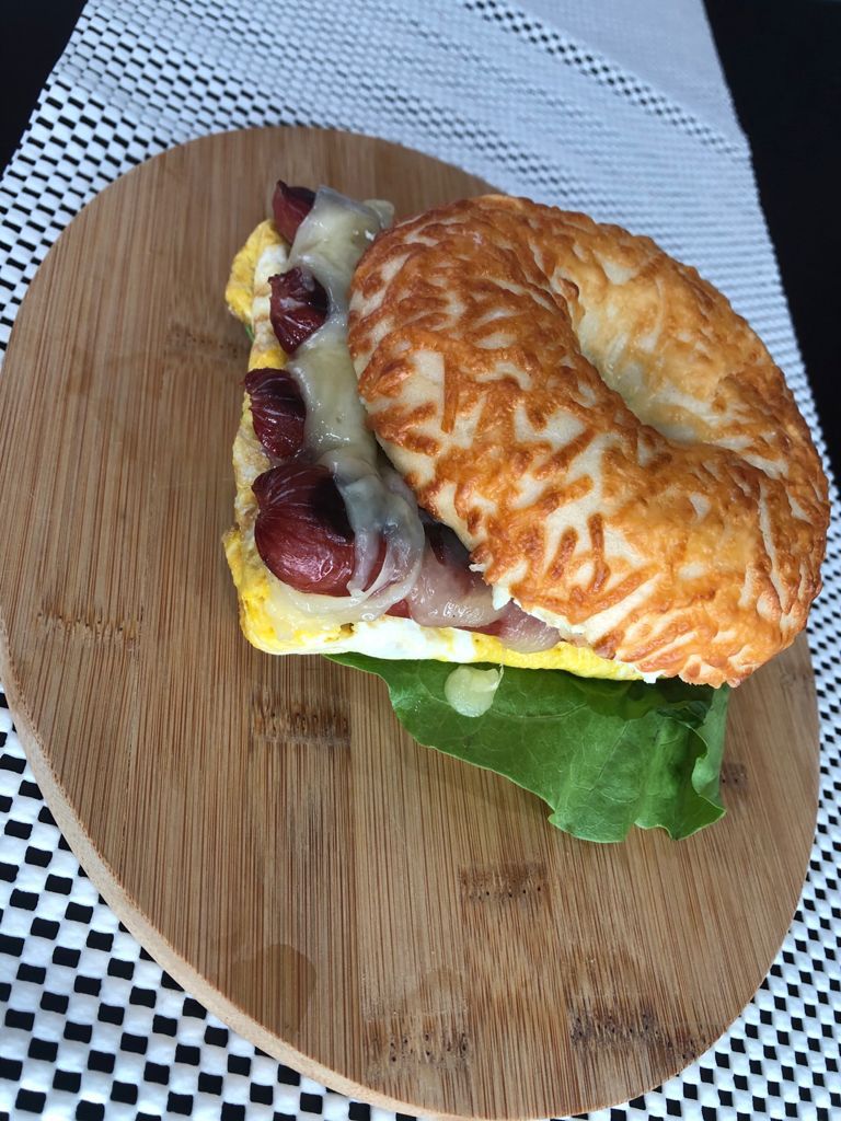 Bagel con queso crema, salchicha de res, omelette de huevo, queso, lechuga, elaborado con receta de la casa, (pan a elegir, parmesano, ajonjolí o natural).