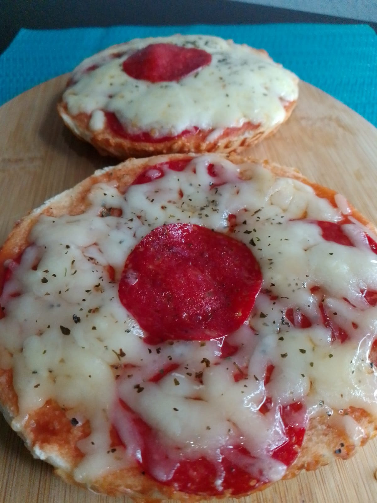Bagel con queso crema, salsa de tomate, pepperoni y queso.