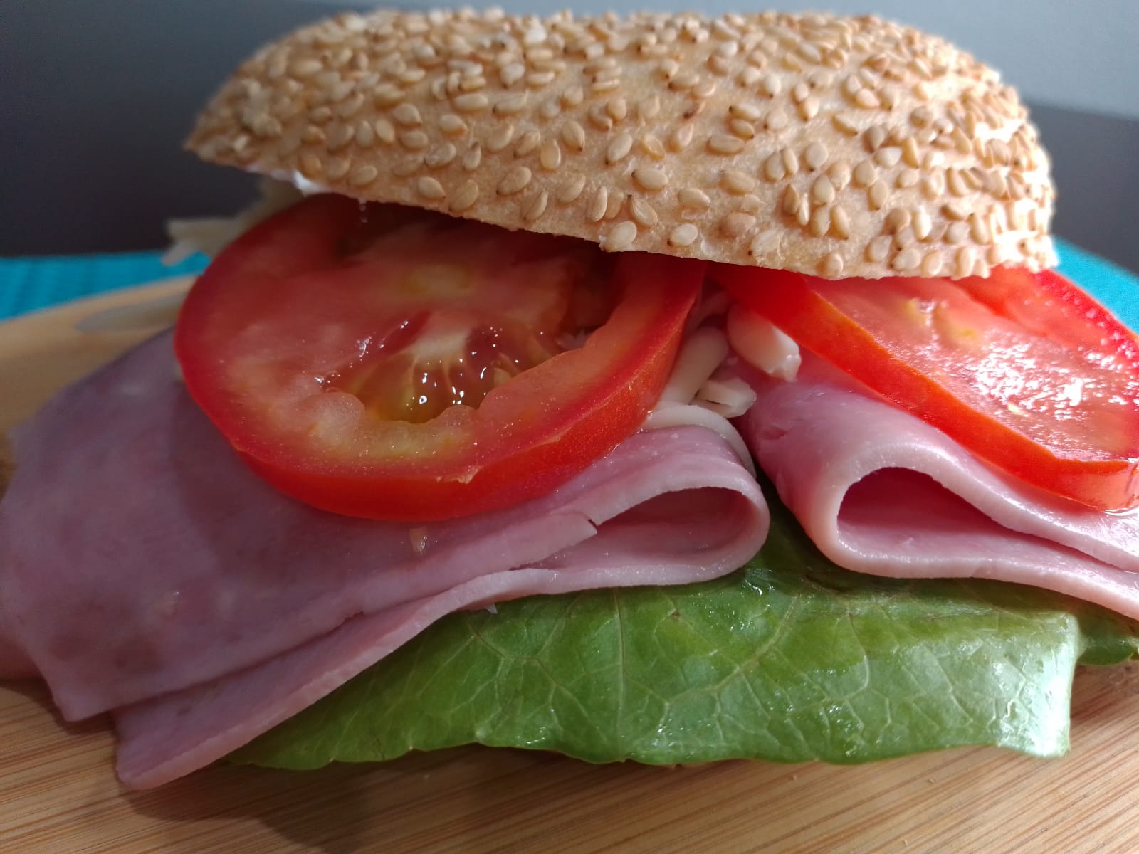 Bagel con queso crema, jamón de pavo, lechuga, tomate, queso, elaborado con receta de la casa, (pan a elegir, parmesano, ajonjolí o natural).