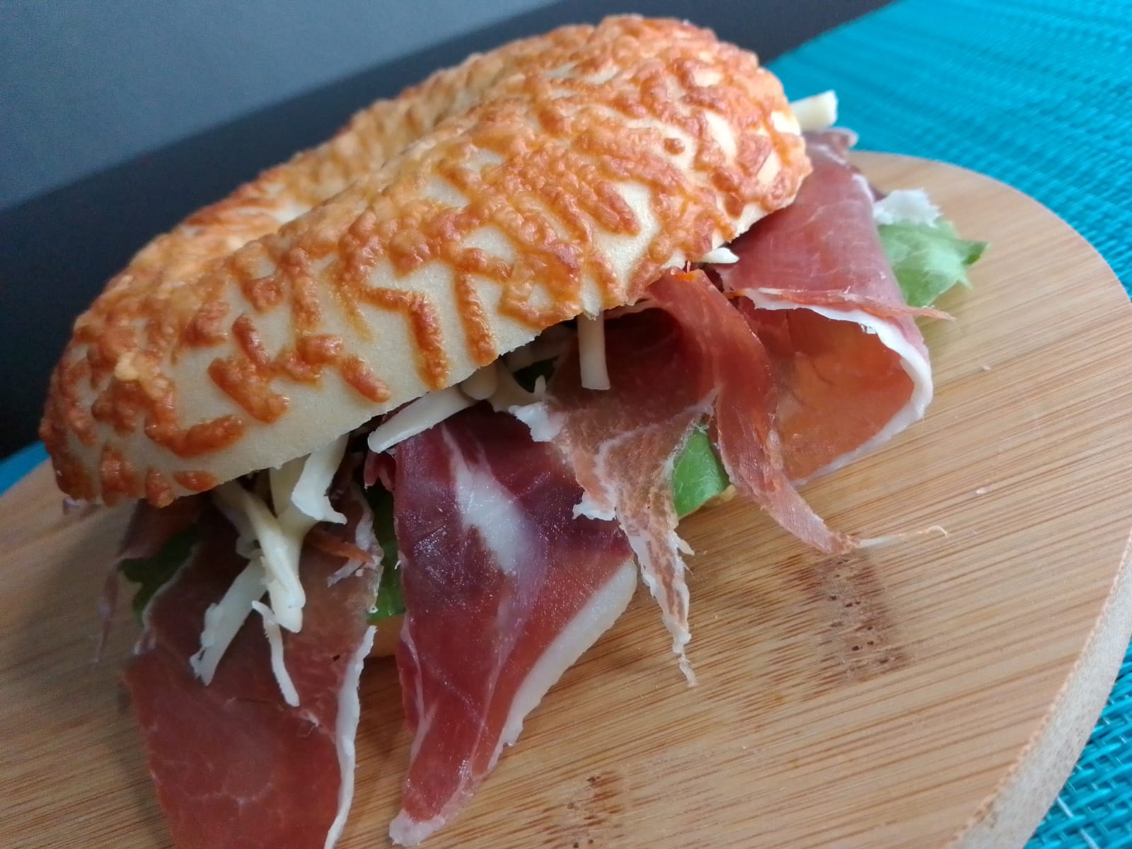 Bagel con queso crema, jamón serrano, lechuga, queso, elaborado con receta de la casa, (pan a elegir, parmesano, ajonjolí o natural).