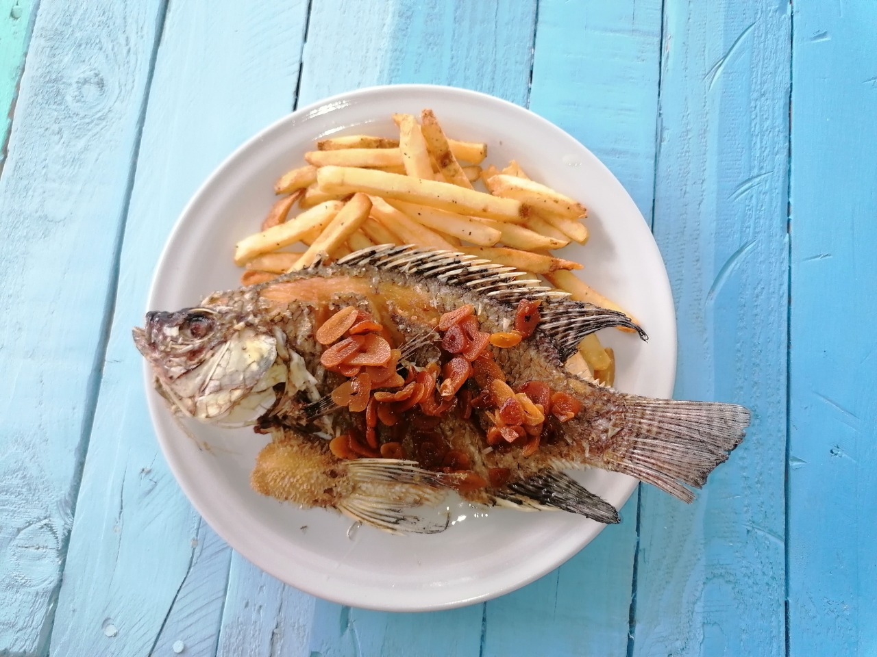 Pescado fresco, chile habanero, jícama, piña, cebolla, tajín, cilantro, jengibre
