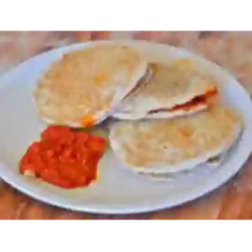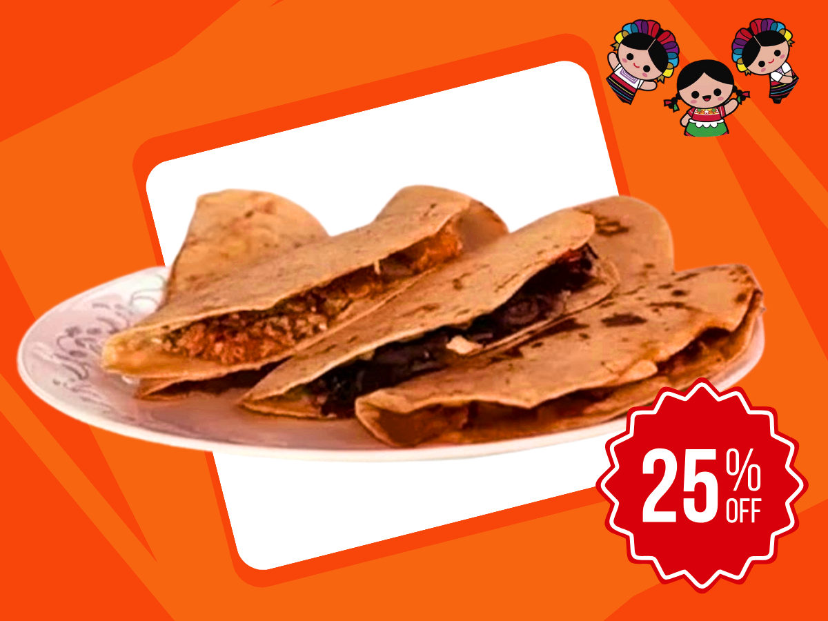 1 Quesadilla al comal con un guisado (papa con chorizo, tinga de pollo entre otros) y queso Oaxaca, salsa verde o roja.