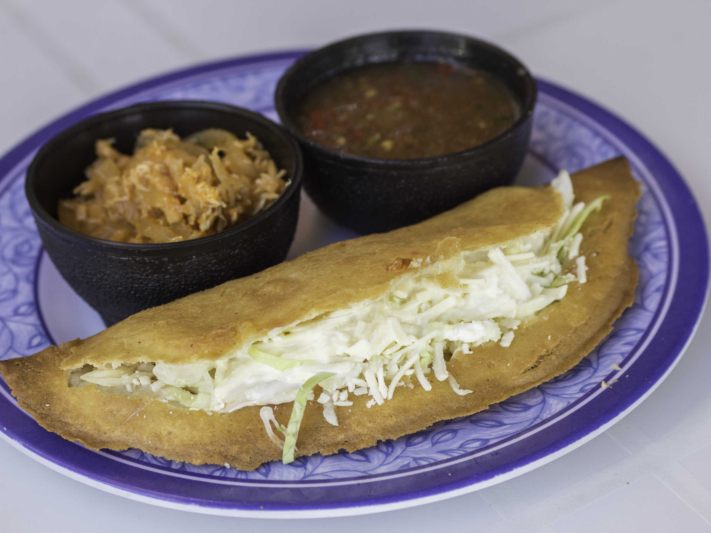 Se sirve con frijoles negros por dentro, cebolla, lechuga y queso.