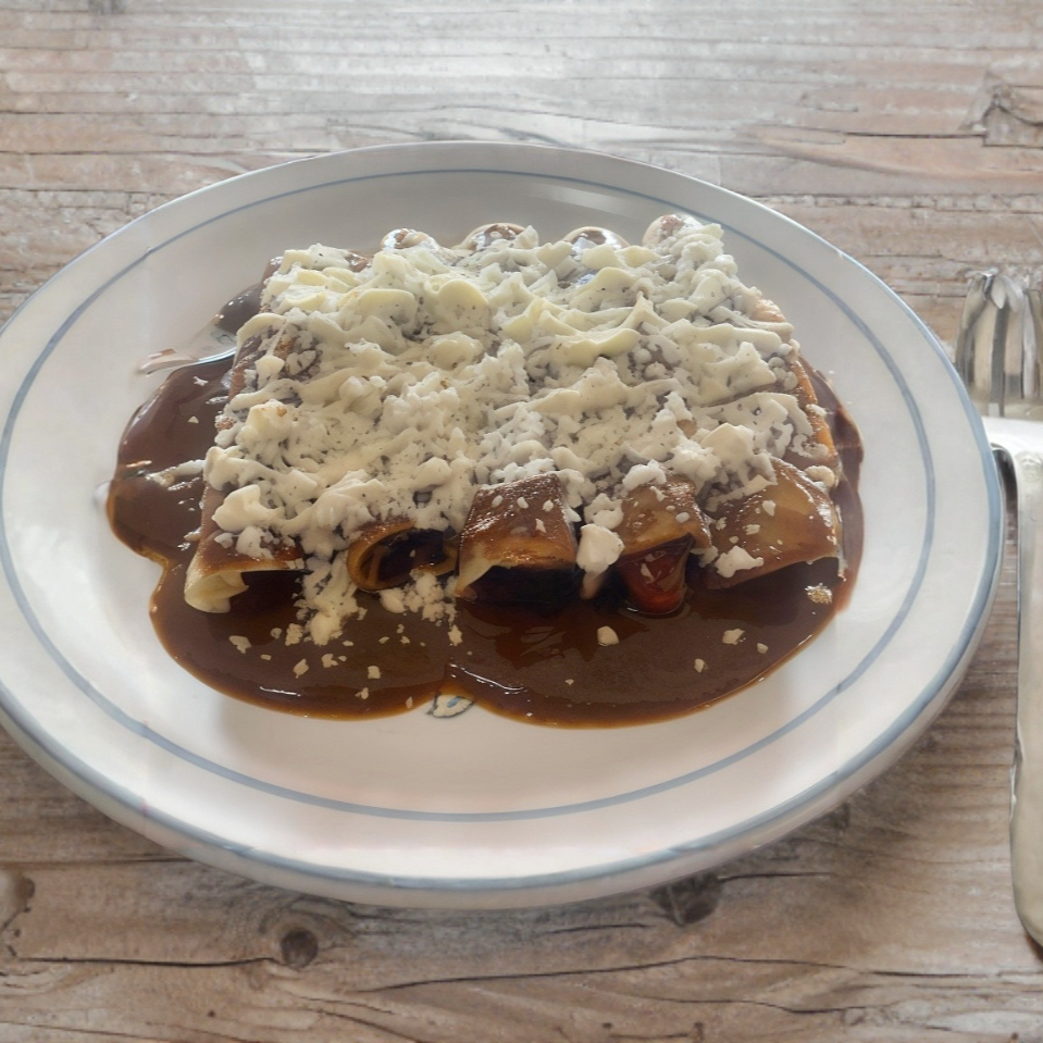 5 tortillas con pollo, bañadas en mole, queso y crema.