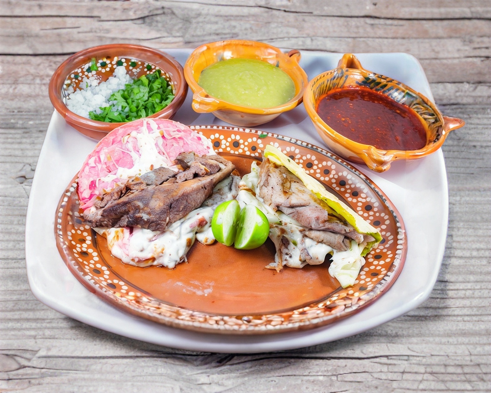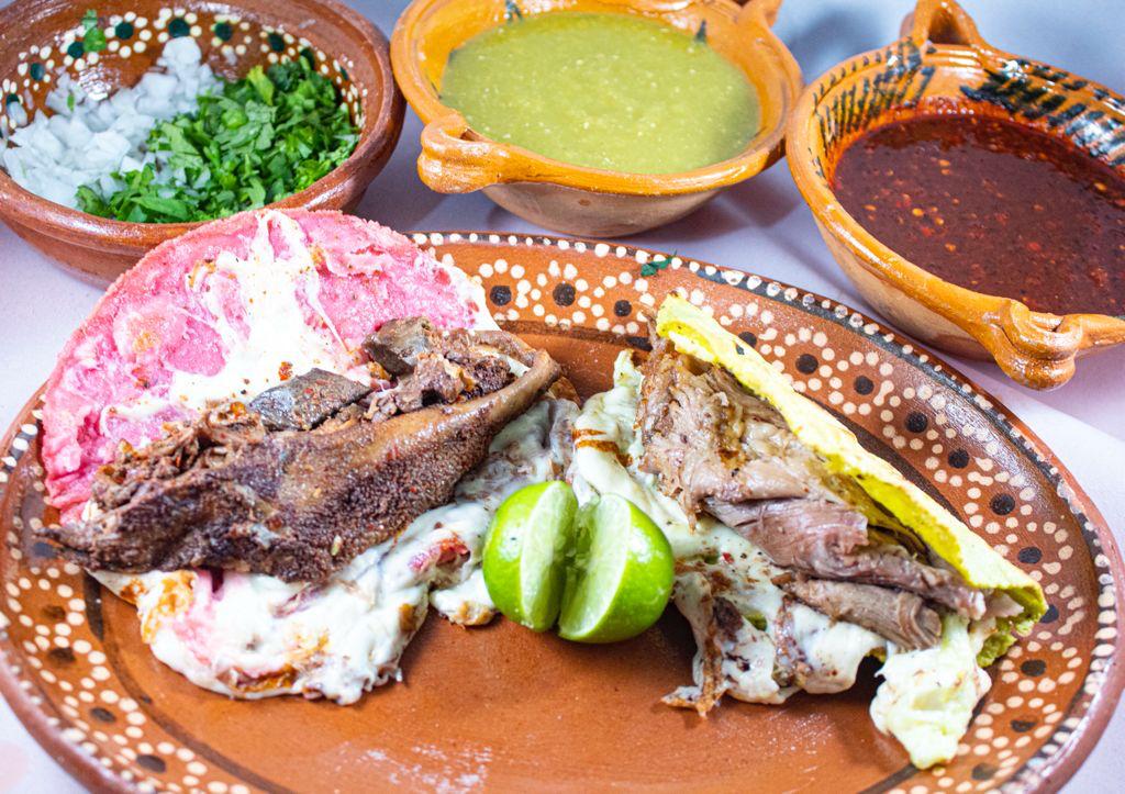 barbacoa surtida que inclye salsa roja, verde y verdura. No incluye tortillas