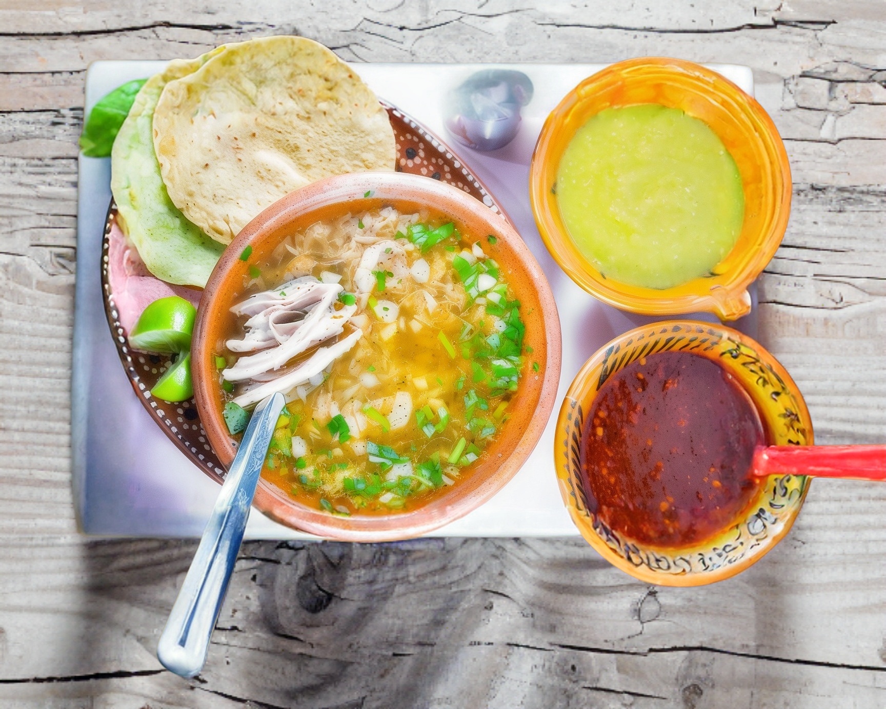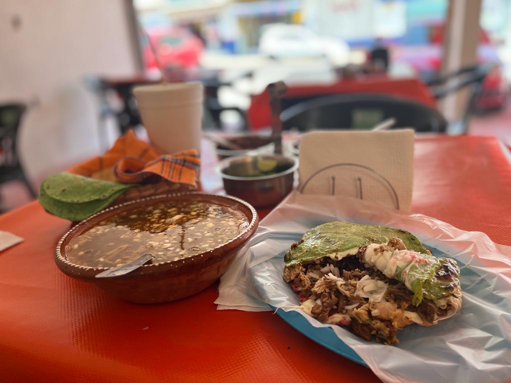 tortilla dorada con el mismo consome barbacoa maciza y cebolla cilantro aparte
