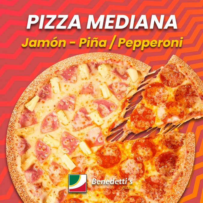 Exquisita pizza de 30 cm, elaborada mitad jamón-piña y mitad pepperoni ideal para compartir.