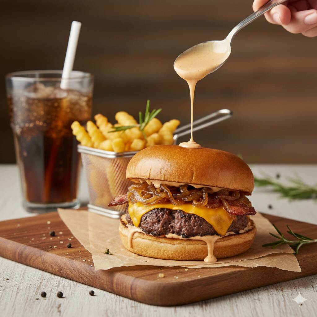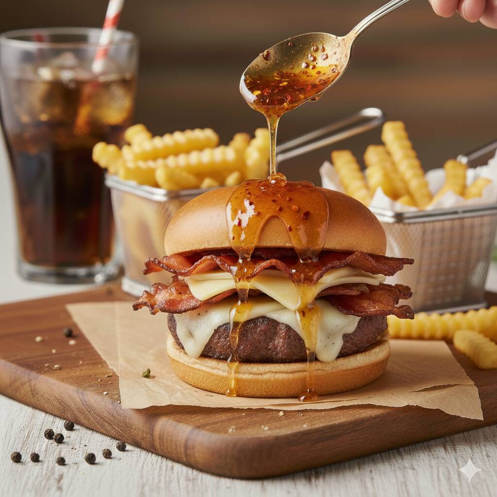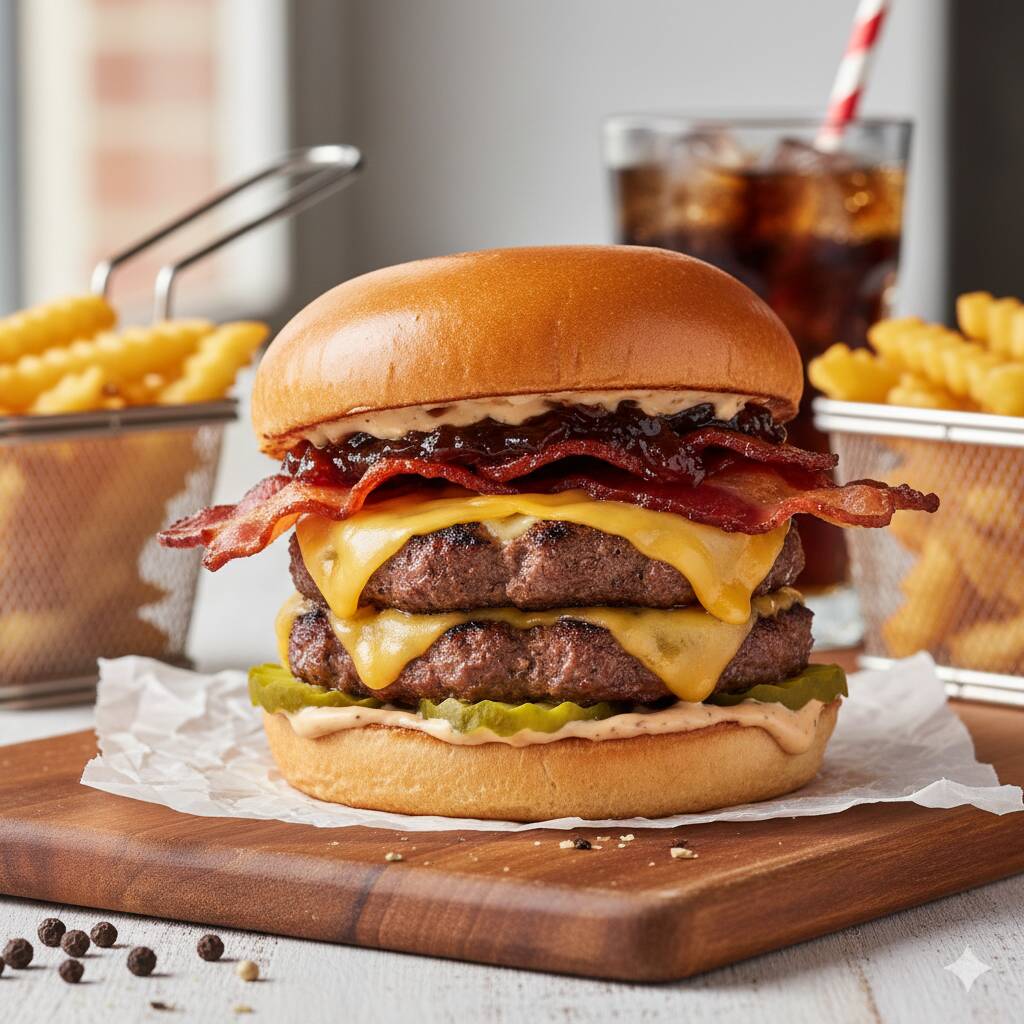 DOBLE CARNE SMASH PAN BRIOCHE QUESO MONTERREY QUESO CHEDAR QUESO GOUDA DOBLE TOCINO AHUMADO MERMELADA DE TOCINO SALSA BEST BUNS Y PEPINILLOS