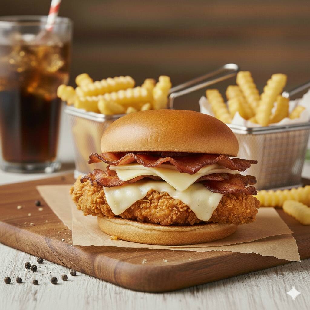 PECHUGA DE POLLO MARINADA EN REECETA DE LA CASA CRUJIENTE Y JUGOZA QUESO MONTERREY TOCINO AHUMADO Y SALSA ESPECIAL BEST BUNS