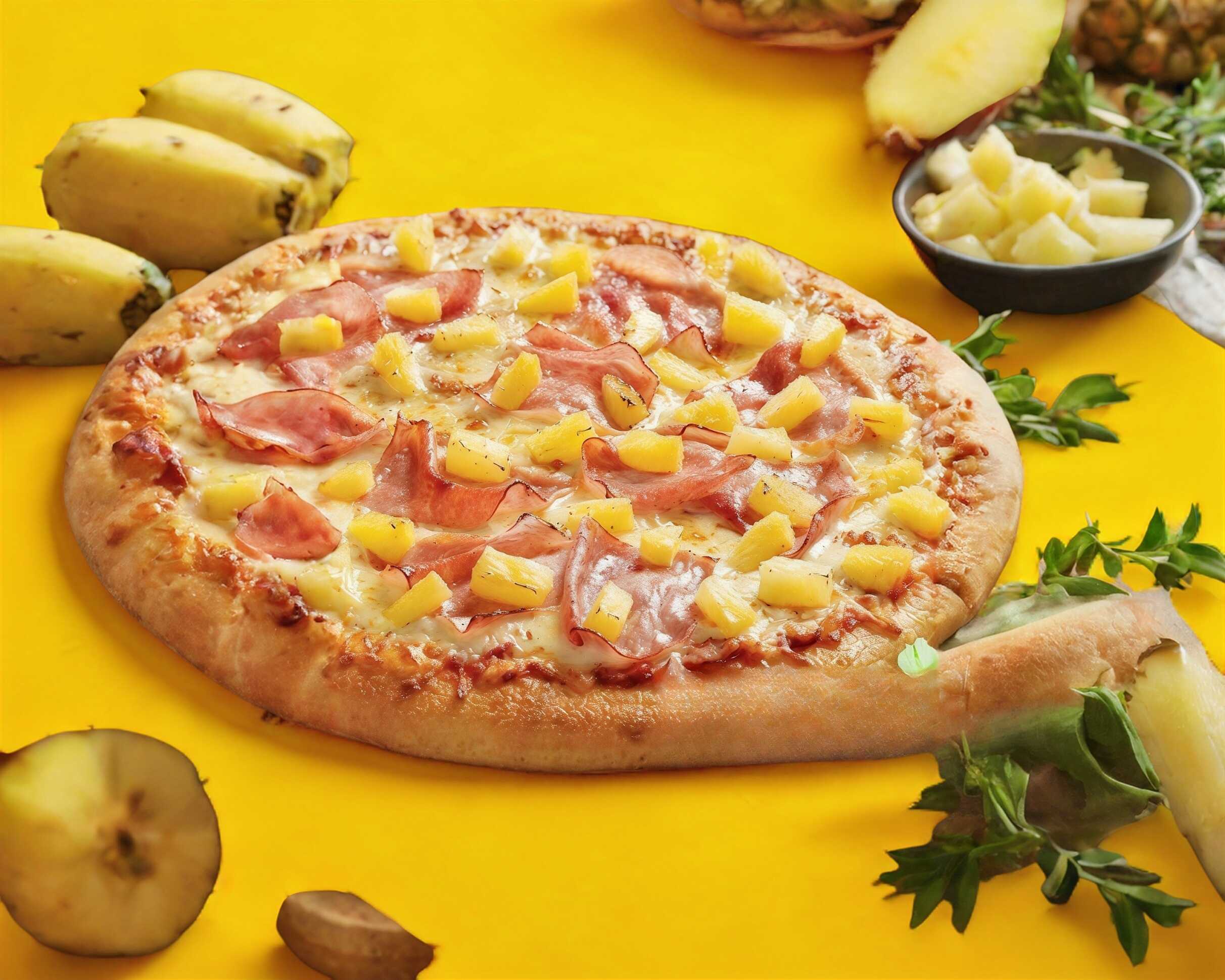 pizza de 40 cm de diámetro bañada en salsa de la casa con jamon y piña gratinada en 3 quesos