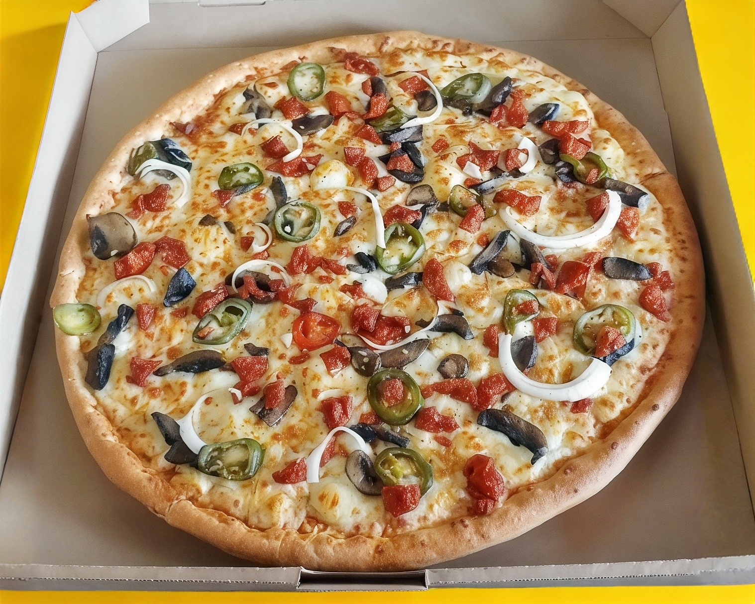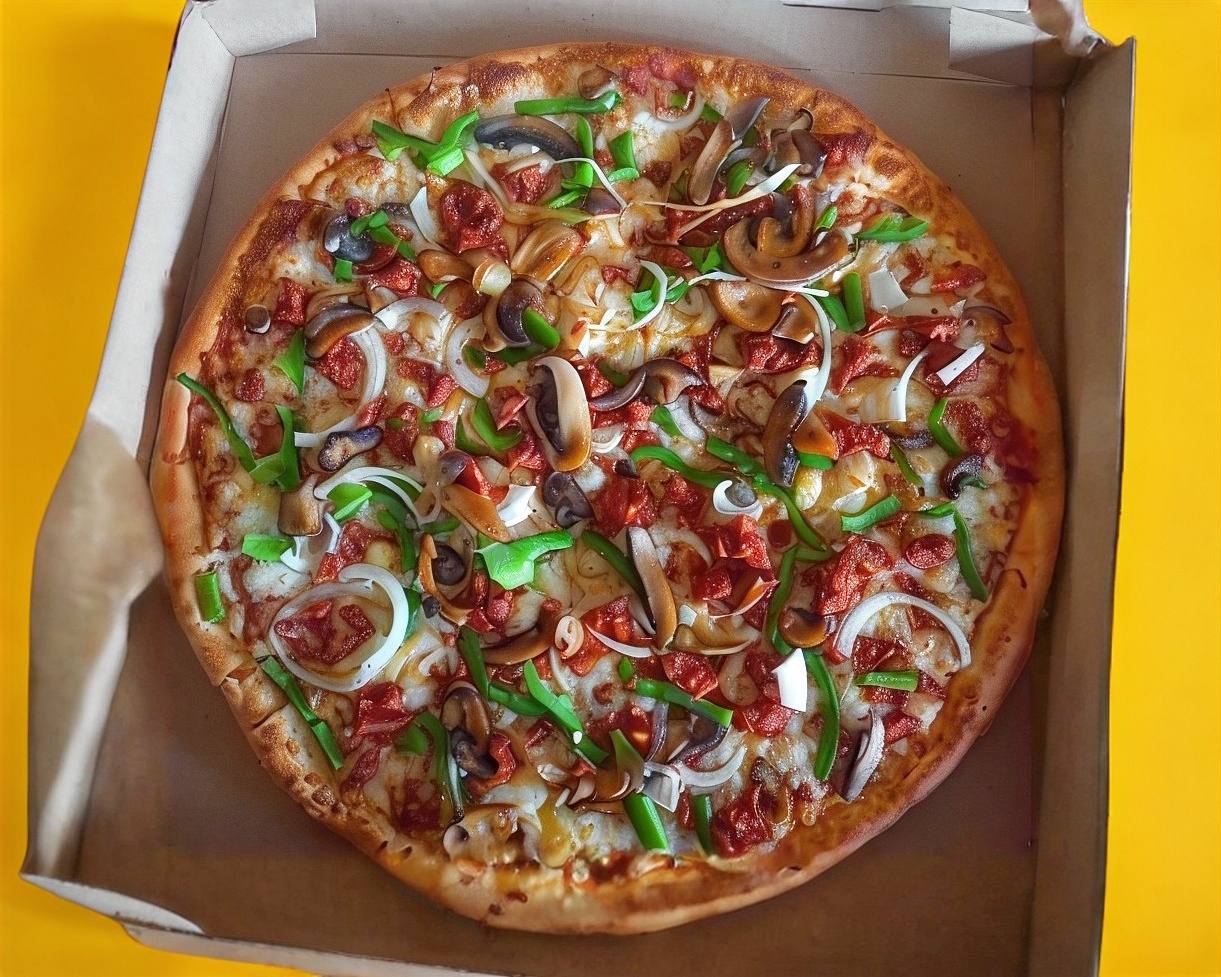 pizza de 33cm de diametro bañad en slsa de la casa con jamon, salami,champiñon, chorizo, cebolla y pimiento verde gratinada en 3 quesos