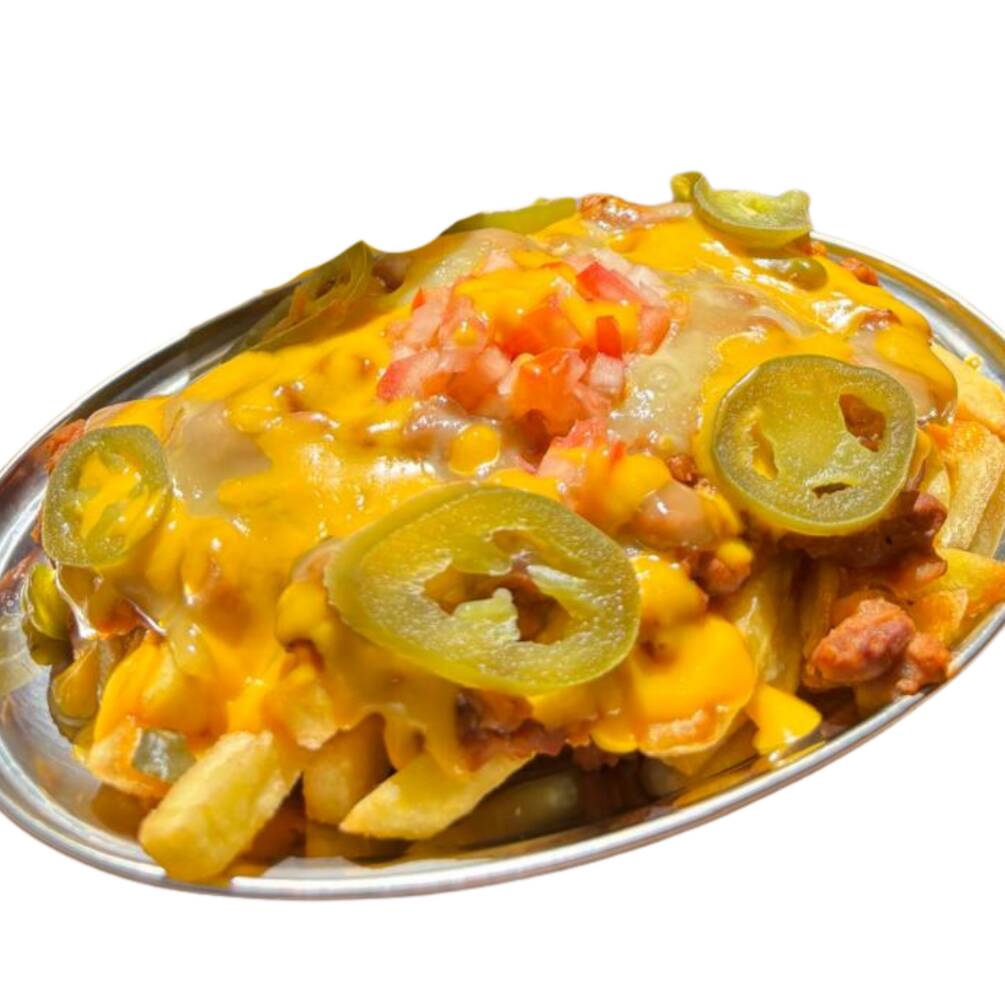 Papas a la francesa con 225 gramos de chilli banadas en queso amarillo y pico de gallo