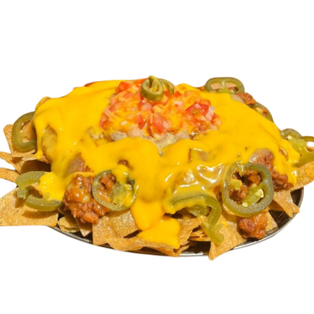 Totopos de maiz con 300 gramos de chilli banados en queso amarillo y pico de gallo.