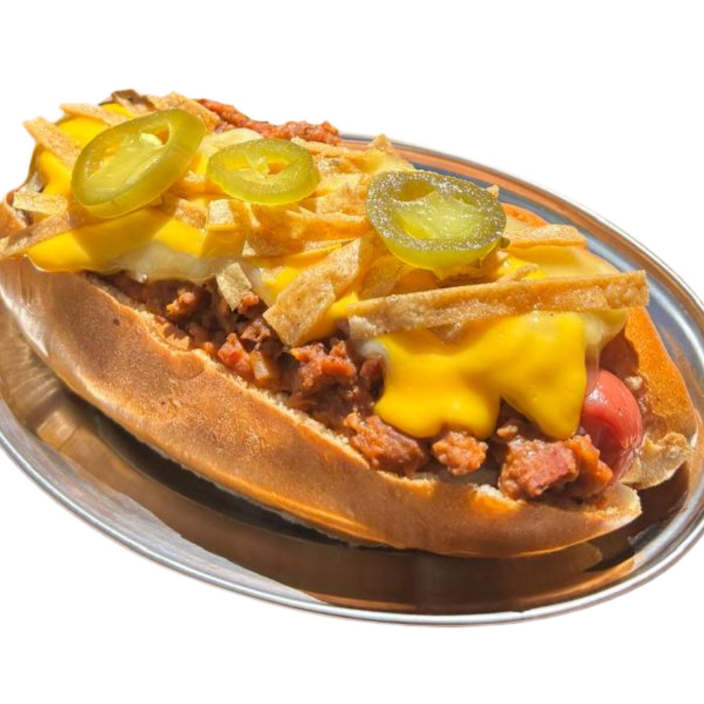 Pan y salchicha asada con 150 gramos de chilli, queso amarillo y tortilla frita