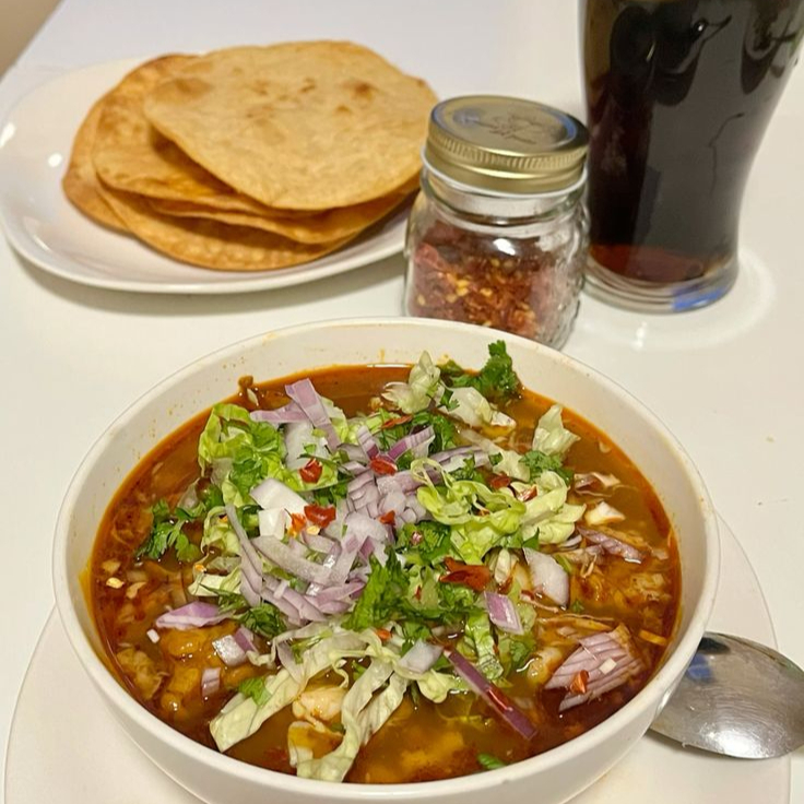 Pozole Rojo de puerco con carne, acompañado con sus guarniciones y 4 tacos dorados de papa con chorizo.